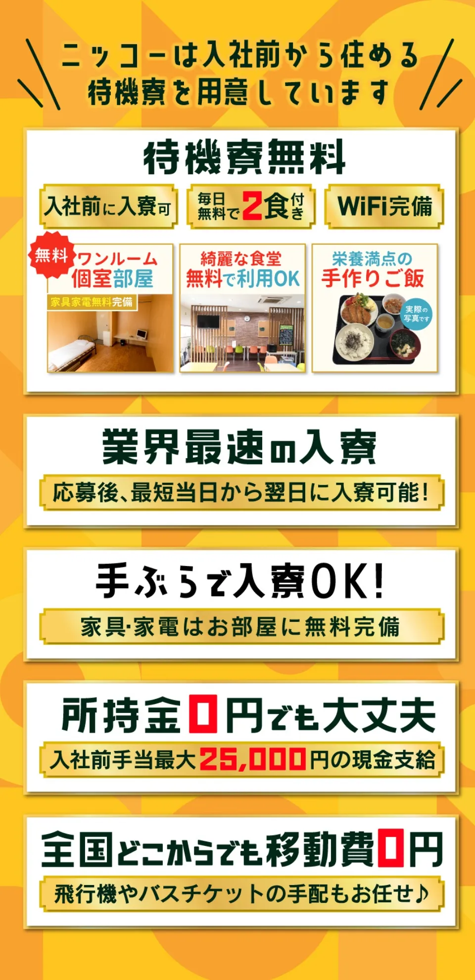 ニッコーでは、待機中の宿泊費を請求することは一切ありません。